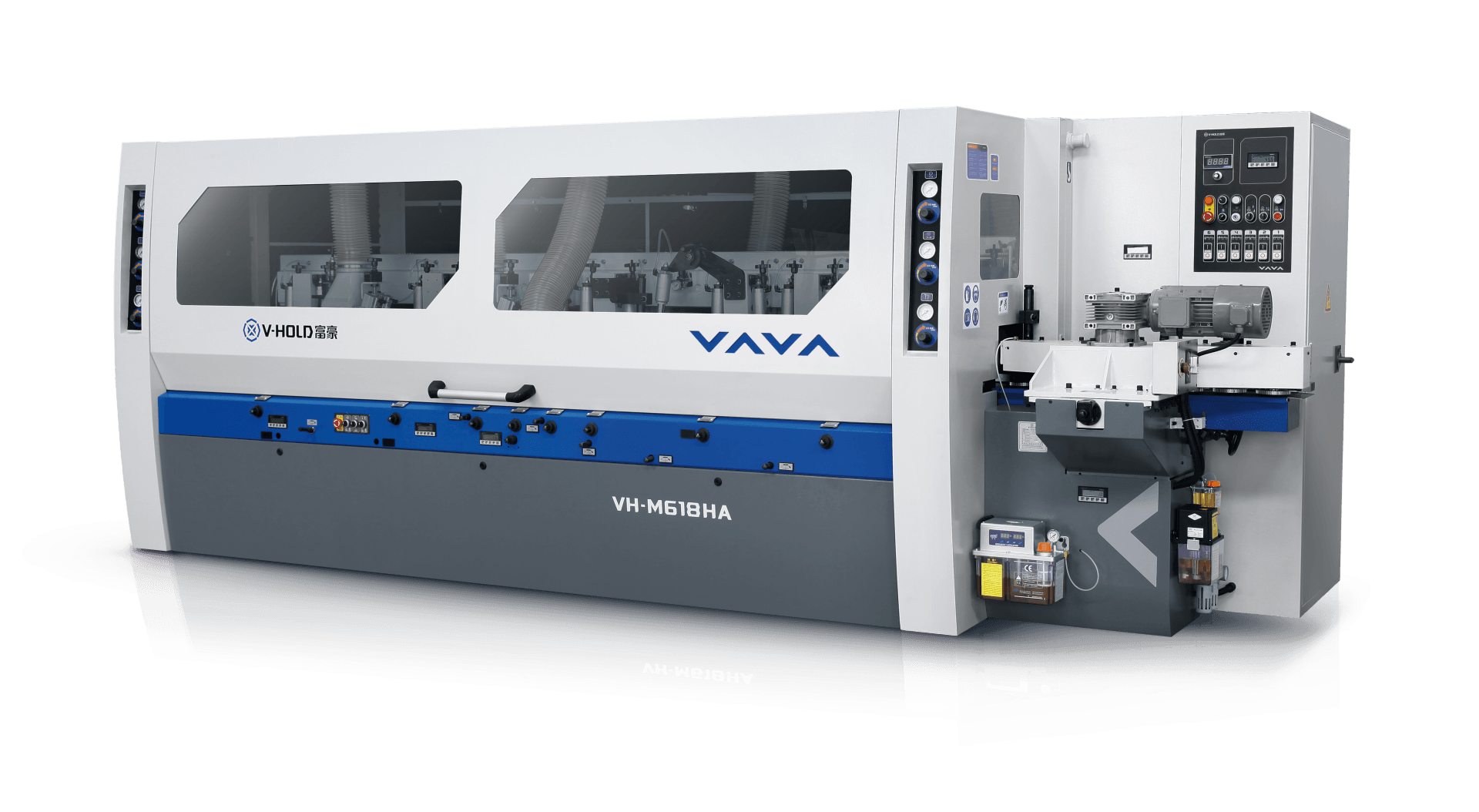 Model VH-M618HA to wyczynowa maszyna zaprojektowana dla zakładów drzewnych, gdzie kluczowym parametrem jest wydajność liczona w tysiącach metrów bieżących dziennie. W odróżnieniu od standardowych strugarek pracujących z prędkością 24-36 m/min, ten model osiąga prędkość posuwu rzędu 100 metrów na minutę. Jest to idealne rozwiązanie do wstępnej obróbki materiału (tzw. „rough material”), produkcji elementów do palet, fryzów czy przygotowania listew do klejenia płyt. Aby sprostać tak ekstremalnym prędkościom, maszyna została wyposażona w chromowane stoły robocze. Proces chromowania utwardza powierzchnię, chroniąc ją przed szybkim zużyciem i ścieraniem, które przy tak szybkim przesuwie drewna byłoby nieuniknione w standardowych maszynach. Dodatkowo, system podawania został wzmocniony o podwójne aktywne rolki dolne na wejściu, co gwarantuje agresywne i skuteczne pobieranie nawet mokrego lub krzywego materiału. Układ wrzecion również został dostosowany do szybkiej pracy – silniki obracają się z prędkością do 8000 obr./min (zamiast standardowych 6000), co pozwala zachować przyzwoitą jakość powierzchni nawet przy bardzo szybkim posuwie. Cały system docisków bocznych sterowany jest pneumatycznie, co pozwala na błyskawiczną reakcję i stałą siłę trzymania materiału.
